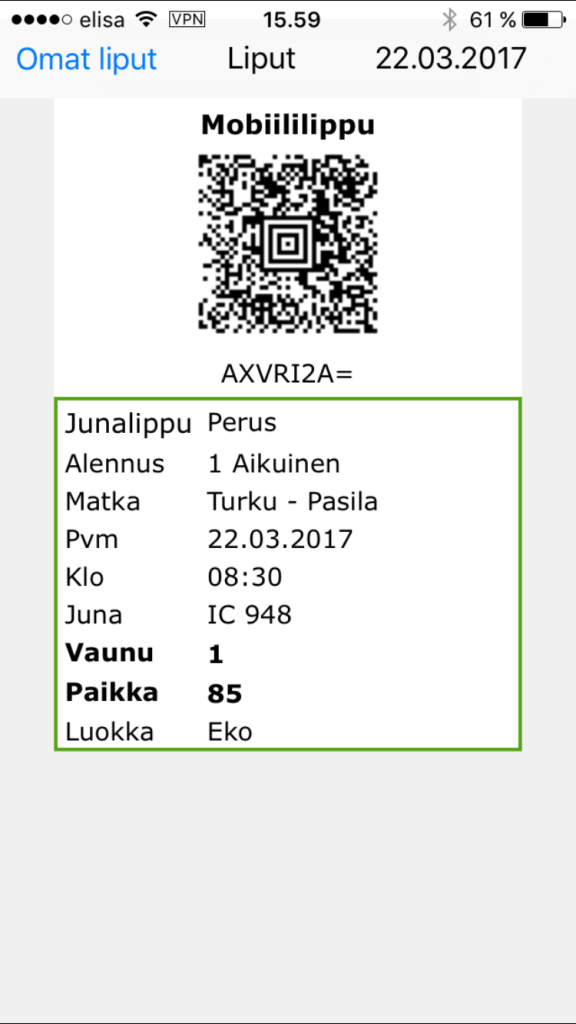Tänään olin menossa Turun juna-asemalta Pasilan asemalle aamulla ja sitten toisin päin iltapäivällä. Tilasin matkaliput etukäteen ja sehän on nykyään kovin helppoa tehdä vaikka sitten kotoa jo etukäteen. Ei tarvitse tulostella lippujakaan, kun ne saa sähköisesti itselleen. Kolmella eri tavallakin vielä: sähköpostiin, linkkinä tekstiviestillä ja siihen Valtionrautateiden, tuttavallisesti VR:n, omaan älypuhelinsovellukseenkin.